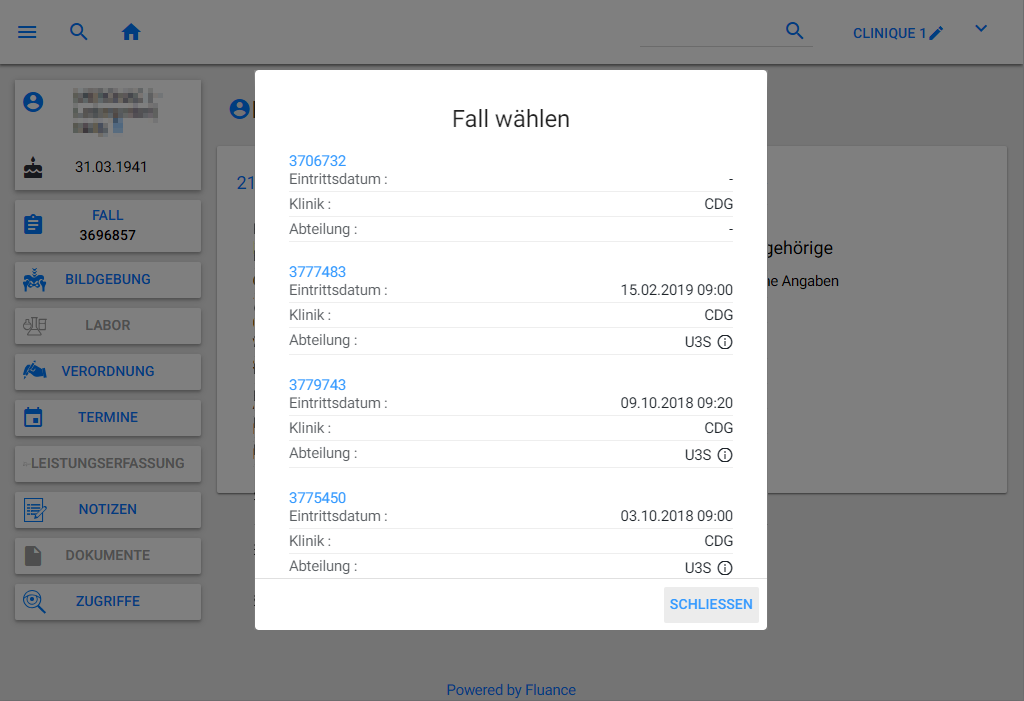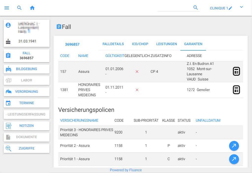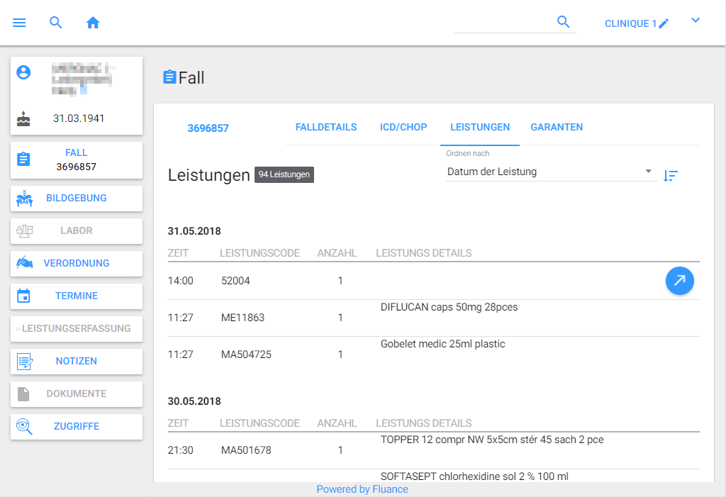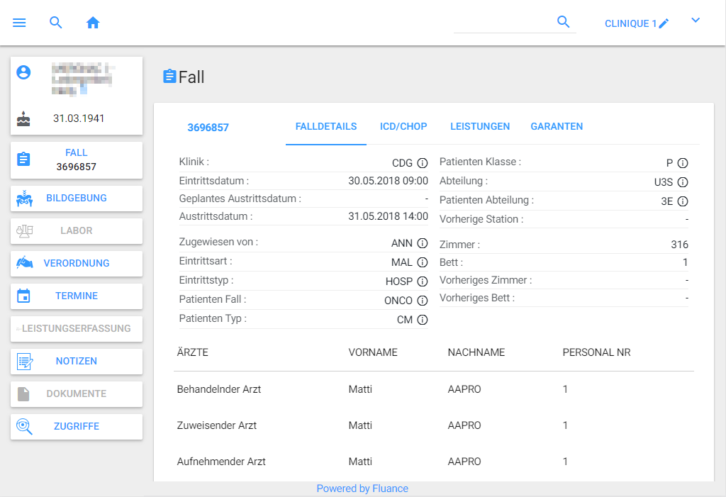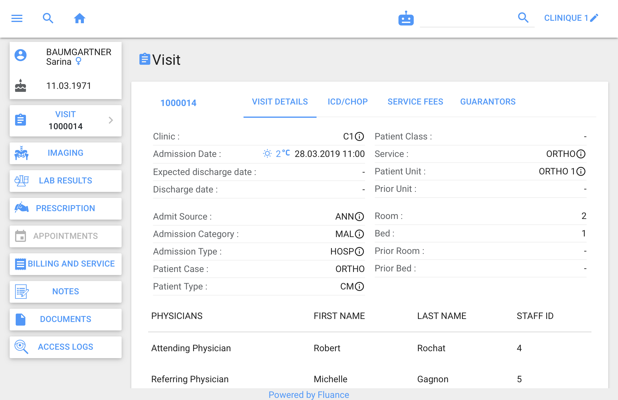 Information as: clinic, admission date, discharge date, patient location, insurance class, physicians